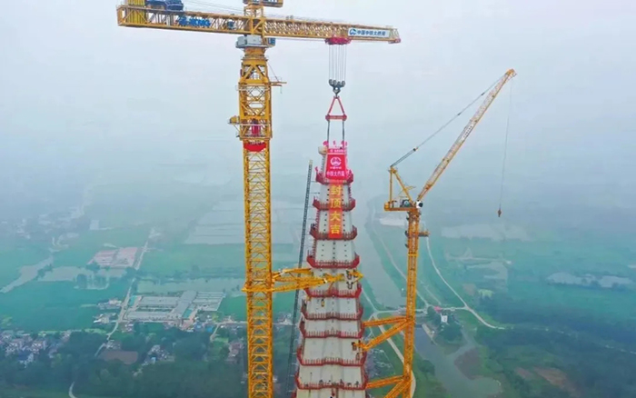 本次封頂的4號墩主塔為大橋中塔柱,塔高345.6米,是全橋最高主塔,采用分塊大節(jié)段整體吊裝,共分39個吊裝節(jié)段,單節(jié)鋼塔最大重量為482.7噸。